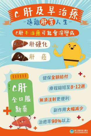 108年起C肝全口服藥物治療已納入健保給付,C肝治療新藥不只副作用低、使用簡便、療程縮短,治癒率更高達97%以上。請民眾一定要把握機會,配合醫師建議,接受追蹤與治療。