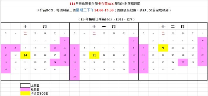 卡介苗BCG:每個月第二個星期二下午14:00-15:30(因應疫苗效價,請15:30前完成報到)