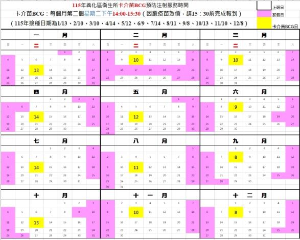 本所卡介苗(BCG)注射日期為每個月第二個星期二下午14:00-15:30(因應疫苗效價,請15:30前完成報到),日期參見日期表附件!!